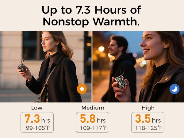 - 3.5-7 Hours All-Day Comfort — Keeps hands cozy from your morning walk to evening dinner without mid-day charging.